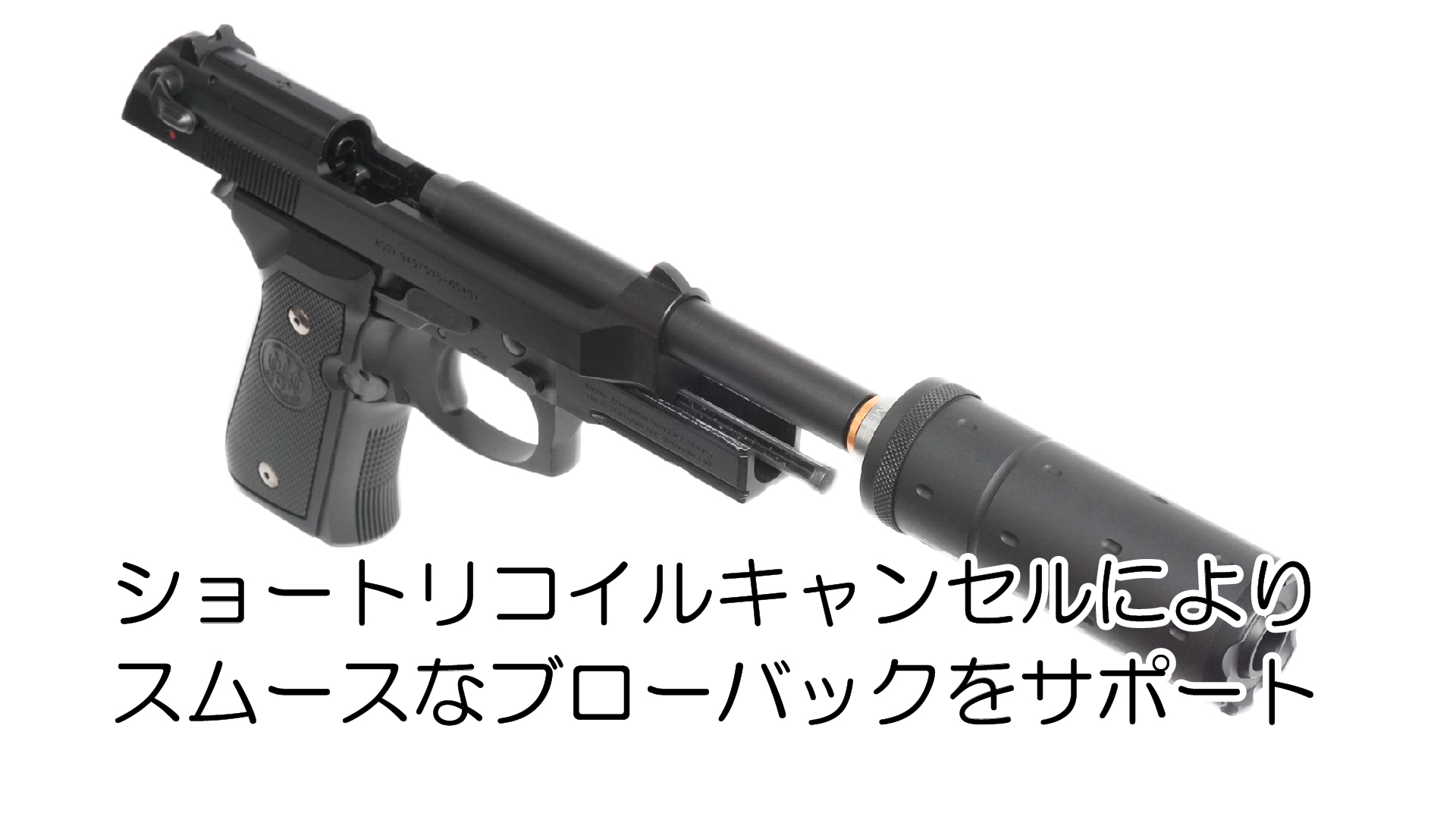ショートリコイルキャンセル式の為、サイレンサーやトレーサー装着時の作動の安定性、命中精度の向上に貢献します。