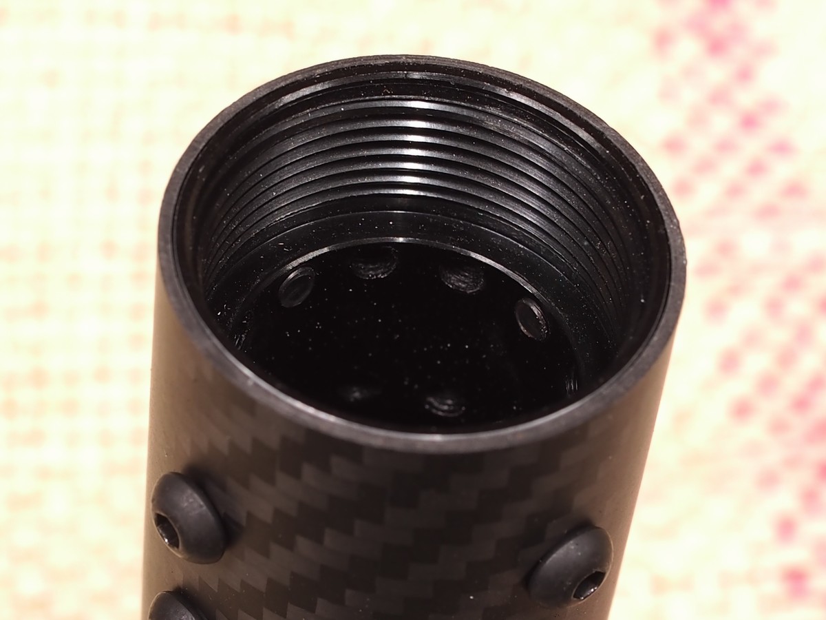 シンプルな円筒形状とすることで、元から軽いカーボンと相まって超軽量 (10インチで75g)。