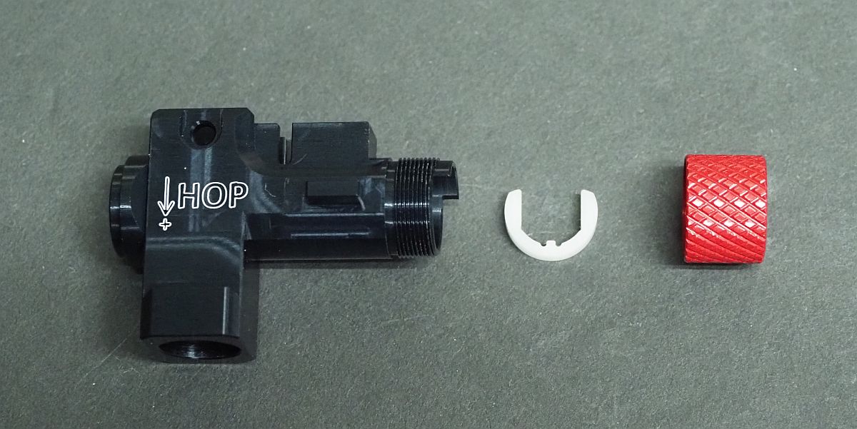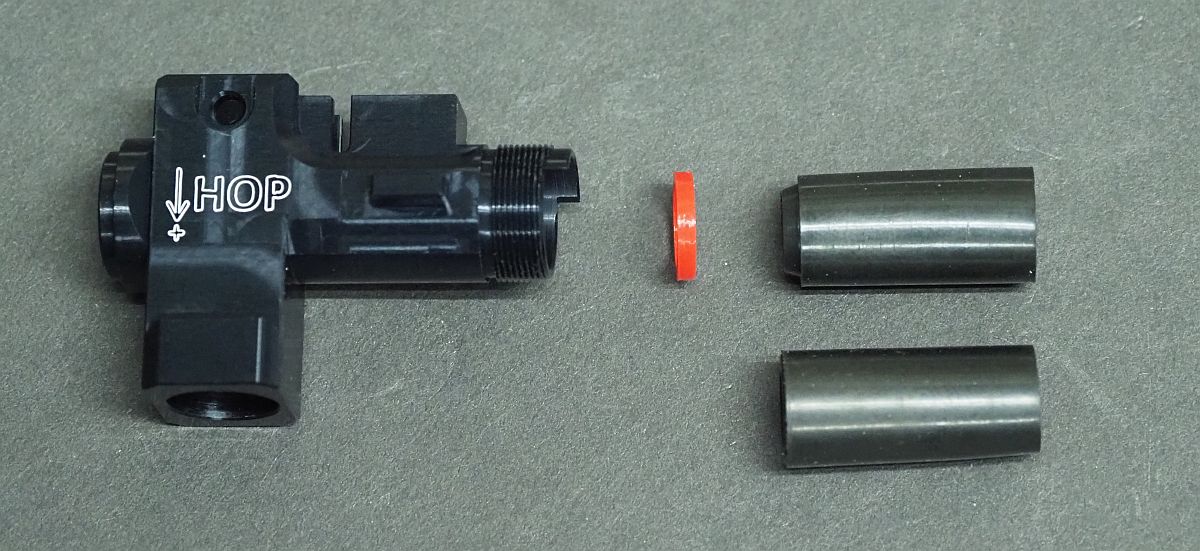 赤いスペーサーパーツを入れることで、従来のスタンダード電動ガン規格のホップパッキンが使用できます。
