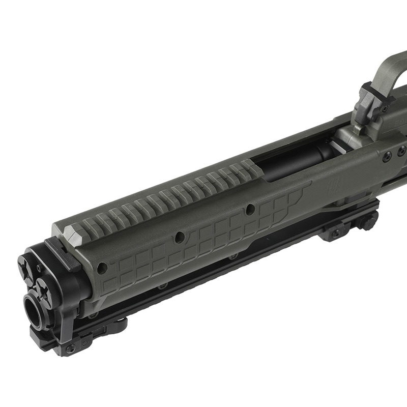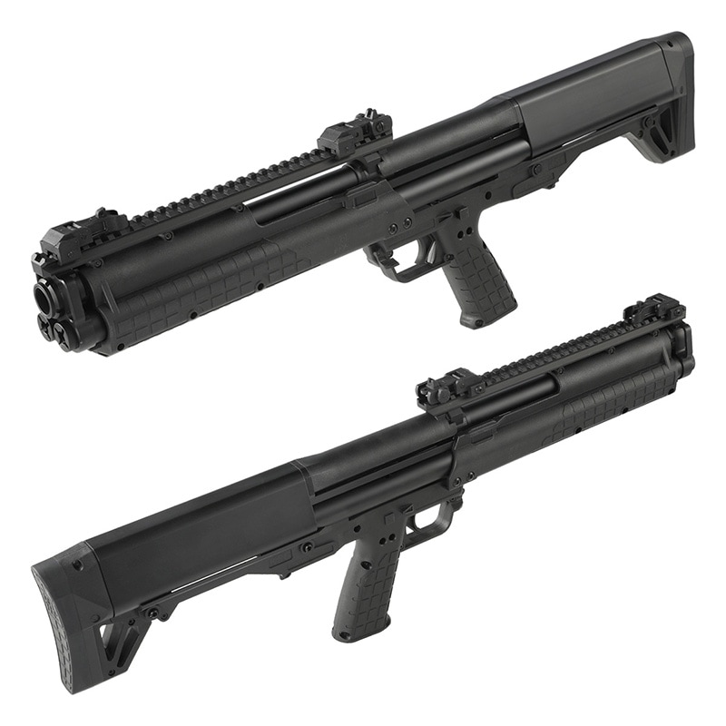 米Kel-Tec社が開発したブルパップ式ポンプアクションショットガン「KSG」は、革新的な構造と高い火力を兼ね備えた実戦仕様の12ゲージショットガンです。左右に配置された2本のチューブマガジンにより、最大14+1発(2.75インチシェル使用時)の装弾が可能で、用途に応じた弾種の切り替えも即座に行える設計となっています。全長約66cmのコンパクトなボディは狭所での操作性に優れ、上下ピカティニーレイルによる高い拡張性も特徴です。排莢は下方向で、左右どちらの利き手でも快適に操作可能なアンビデクストラス設計となっています。