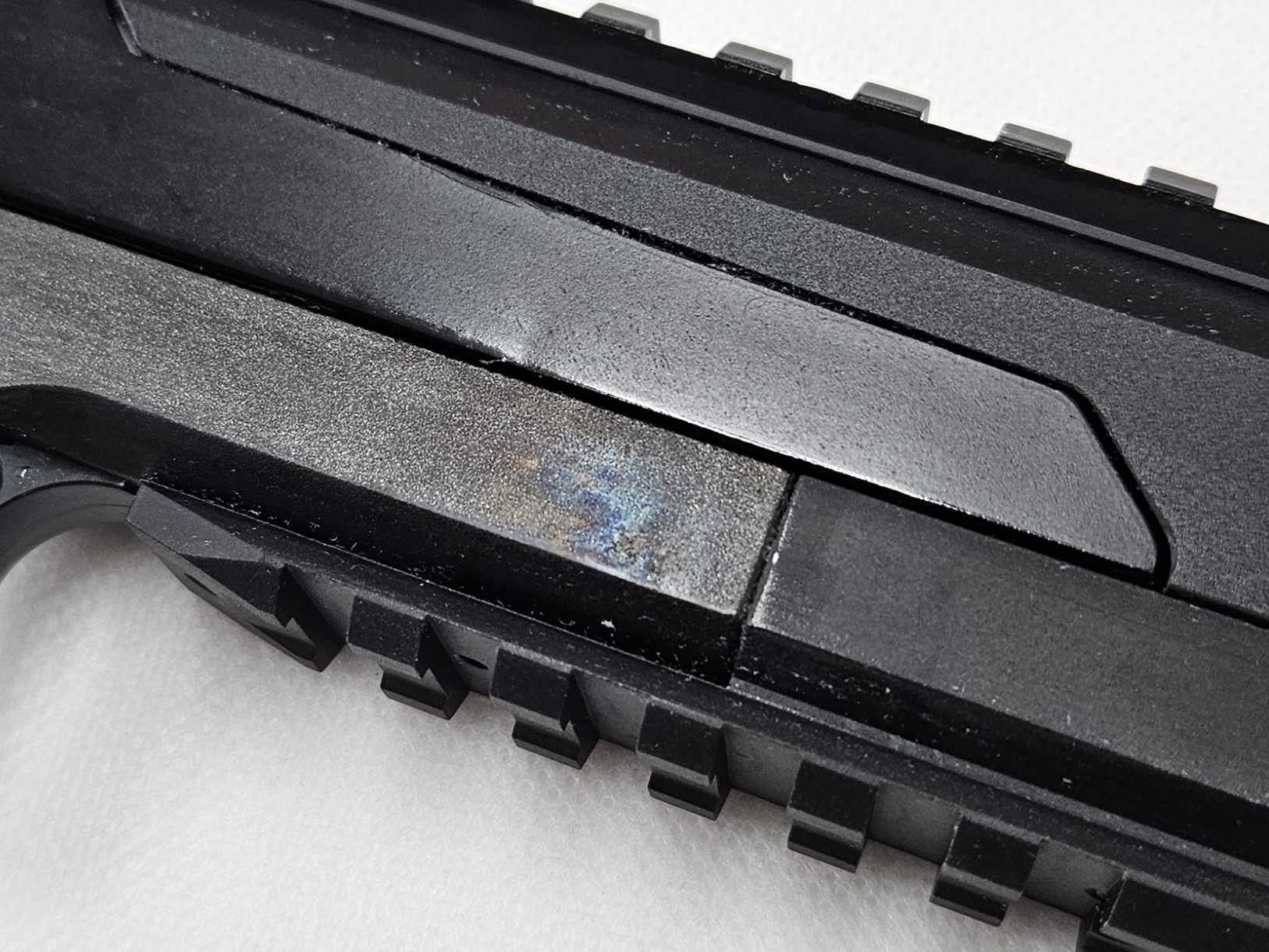 スライドの前半分(フロントブロック)はアルミ合金製にすることでカウンターウェイトとして機能。連射時のブレを抑え込みます。