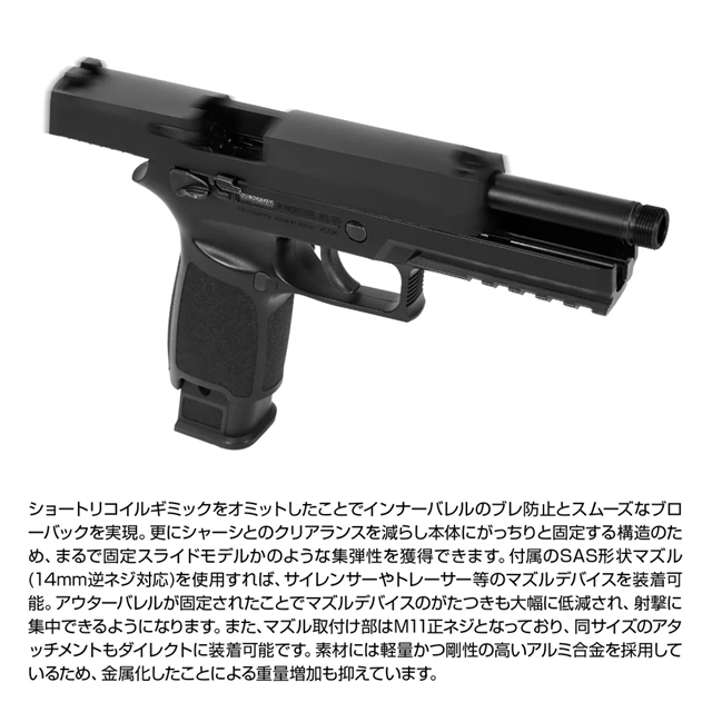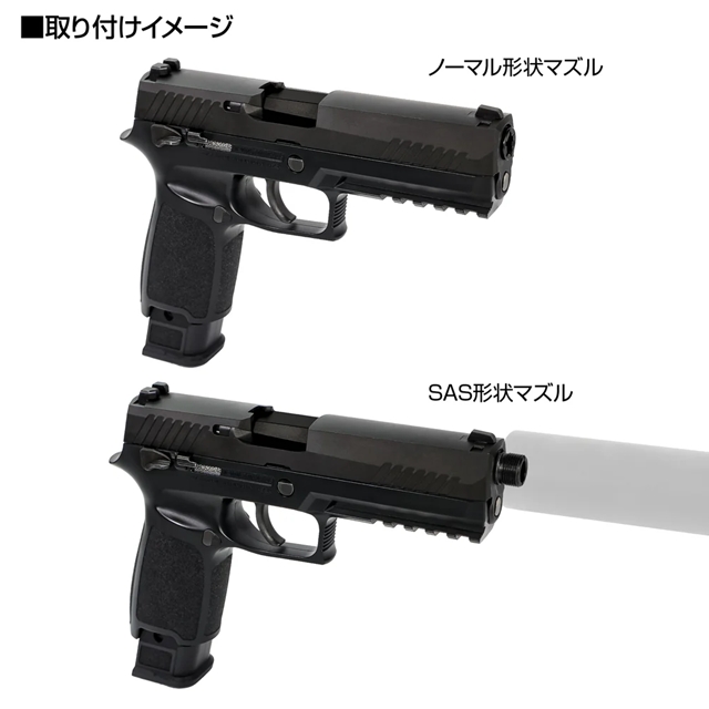 付属のSAS形状マズル(14mm逆ネジ対応)を使用すれば、サイレンサーやトレーサー等のマズルデバイスを装着可能。