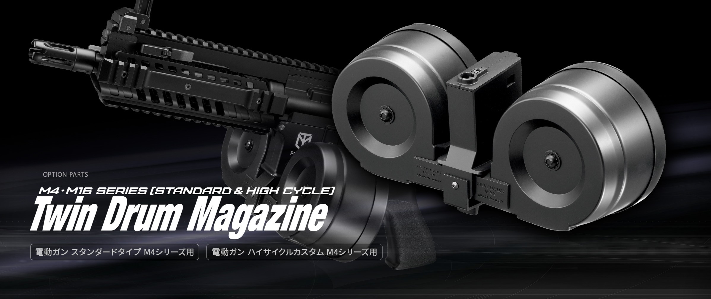 装弾数1,200発、電動ガン スタンダードタイプ&電動ガン ハイサイクルカスタム・M4シリーズ用連射マガジン ※一部のモデルは別売のツインドラムマガジン用変換アダプターが必要です。