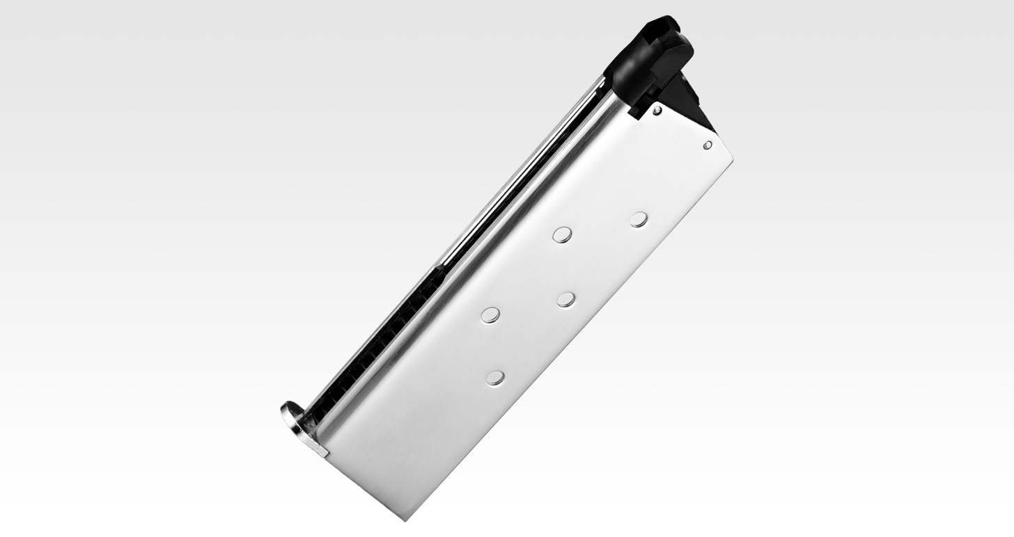 装弾数26発、薄型ながら冷えに強いダイカスト製のマガジンにも、光沢クロームメッキを施しています。